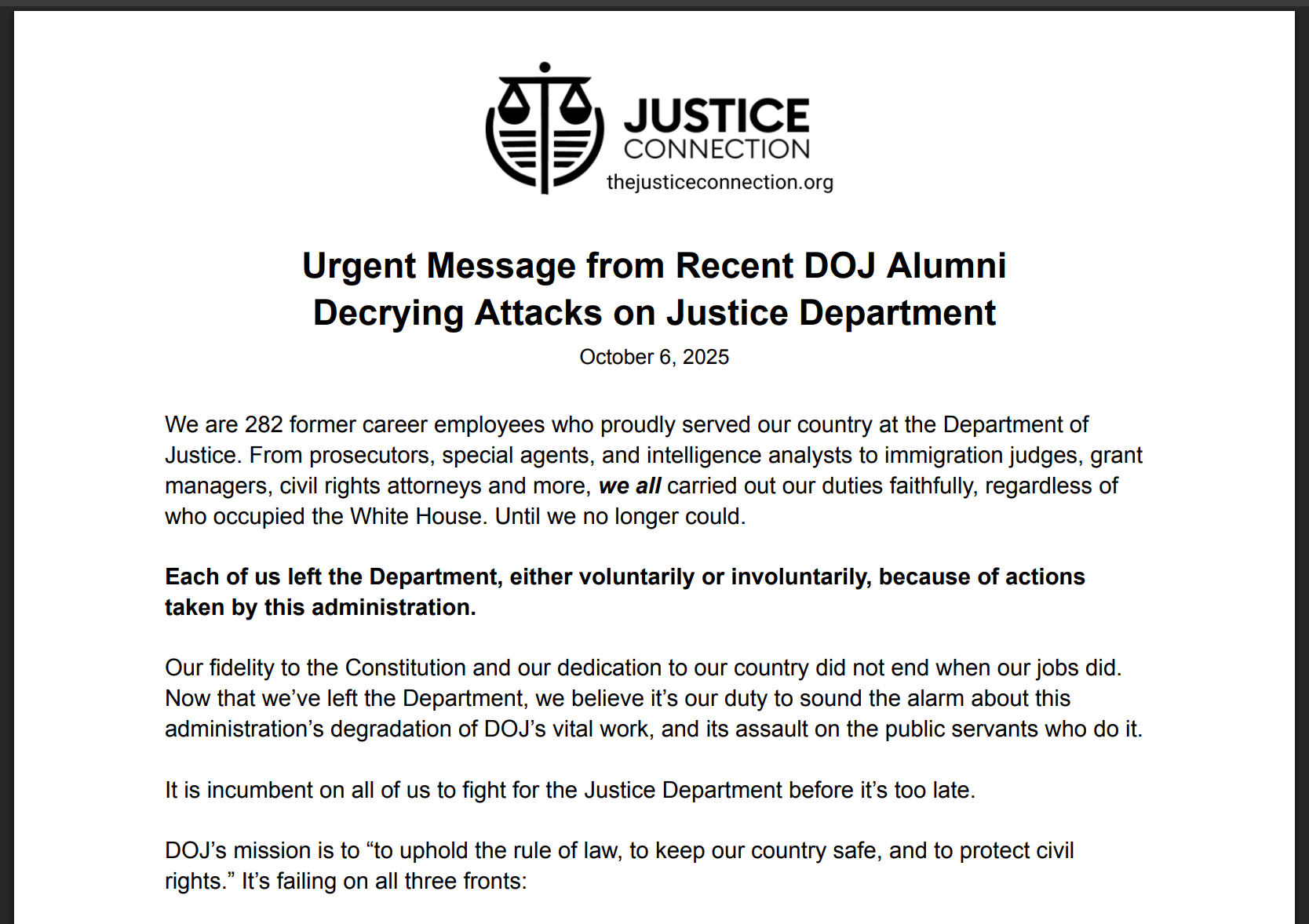 Urgent Message from Recent DOJ Alumni Decrying Attacks on Justice Department